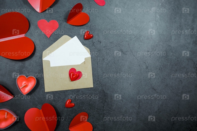 Баннер. Красные сердца, конверт и белый лист бумаги для текста на темном фоне с копией пространства. Концепция праздничного поздравления ко дню святого Валентина
