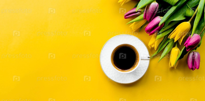 Баннер. Чашка горячего утреннего кофе и букет желто-сиреневых тюльпанов на ярко-желтом фоне. Вид сверху. Крупный план. Скопируйте место для текста. Концепция праздников и пожелания доброго утра