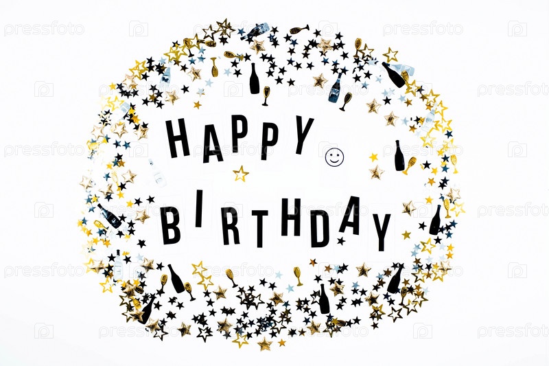 Стильная текстовая рамка с надписью «С днем рождения». Золотые, черные и серебряные конфетти повсюду. Вид сверху на вечеринку по случаю дня рождения. Копипространство
