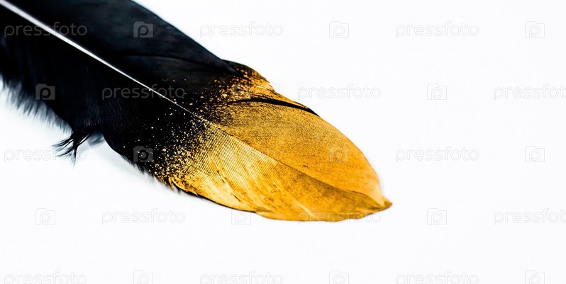 Баннер. Стильное черно-золотое перо. Узор с черными перьями на изолированном белом фоне. Вид сверху. категорически