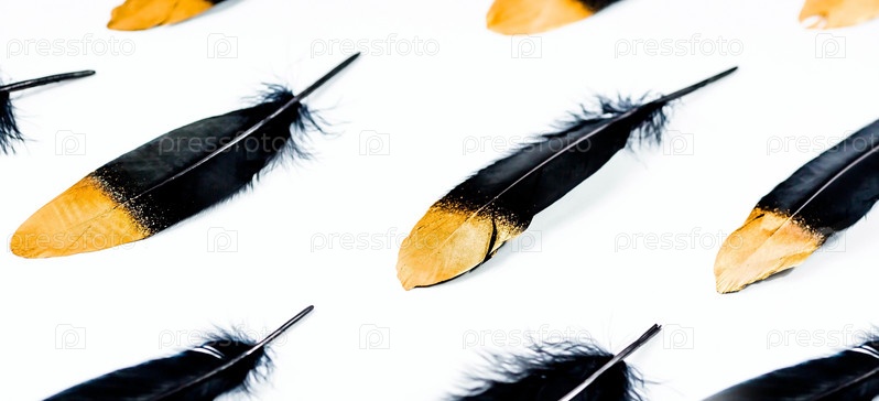 Баннер. Стильное черно-золотое перо. Узор с черными перьями на изолированном белом фоне. Вид сверху. категорически