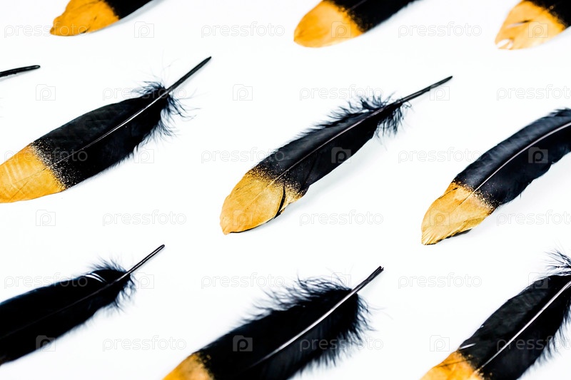 Баннер. Стильное черно-золотое перо. Узор с черными перьями на изолированном белом фоне. Вид сверху. категорически