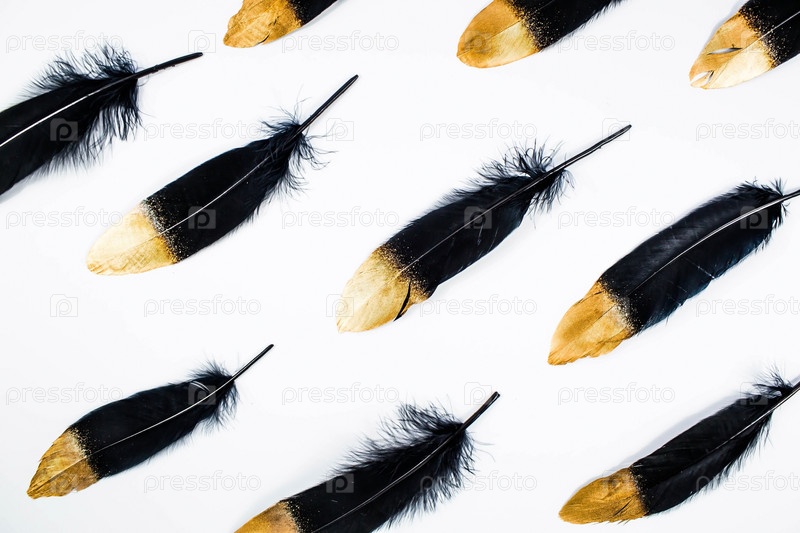Баннер. Стильное черно-золотое перо. Узор с черными перьями на изолированном белом фоне. Вид сверху. категорически