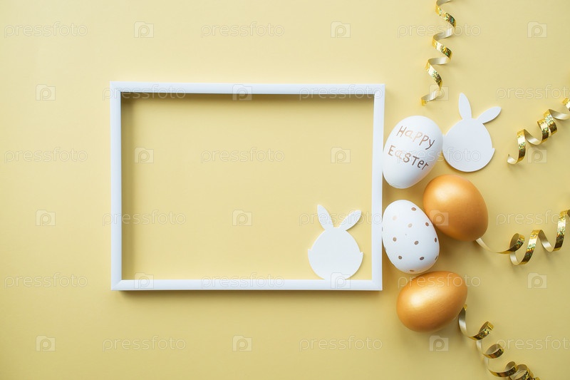 Золотые пасхальные яйца с белой рамкой для текста на желтом фоне. Модная плоская планировка на пасху. Минимальная пасхальная концепция