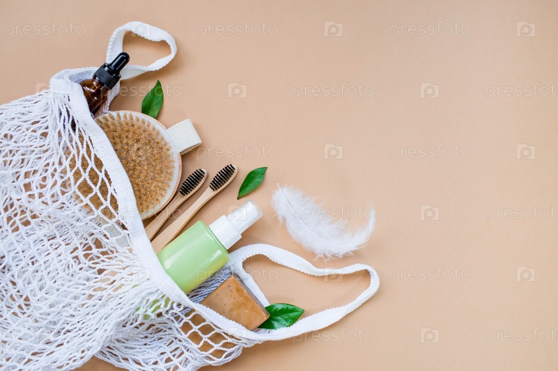 Контейнеры с лосьоном, кремом, массажной щеткой в хлопчатобумажной сумке на бежевом фоне. Вид сверху. Натуральная органическая эко косметика. Макет брендинга салона красоты