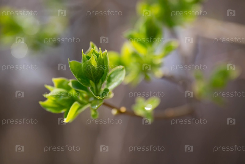 Весеннее время, природа обои. Молодые сиреневые листья и бутон крупным планом. На ветвях появляется новая весенняя листва. Дерево или куст, выпускающий почки. Сезонный лес, размытый фон