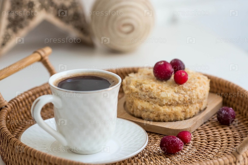 Белый ретро-будильник, торт и чашка кофе на фоне белой кирпичной стены. Понятие «доброе утро»