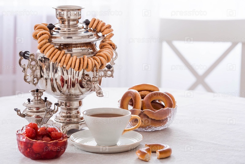 Русские традиции. Чаепитие с самоваром. Натюрморт с чашкой чая, рогаликами, сухофруктами, яблочным джемом, карамельным петушком и русскими самоварами