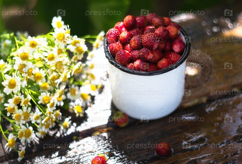 Кружка вкусной, спелой, красной клубники в каплях воды на деревянном столе