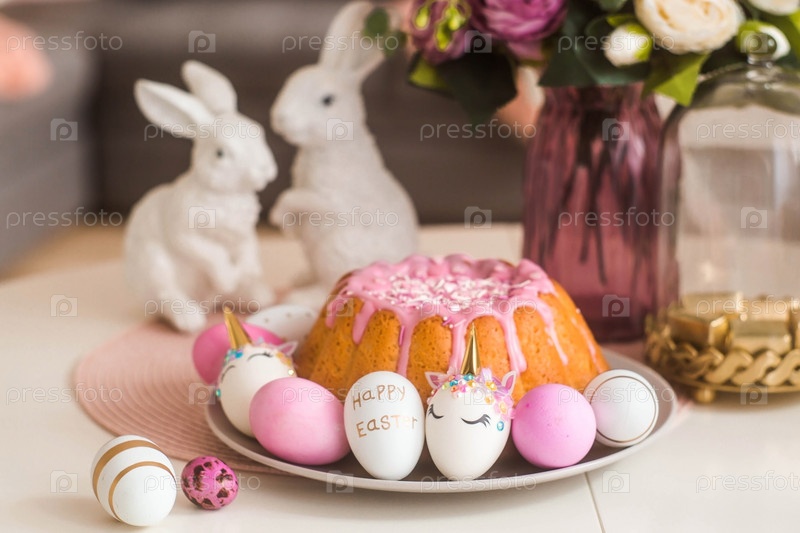 Баннер. Кулич, кролики и яйца в виде единорога и с золотым узором на белом столе. Скопируйте место для текста