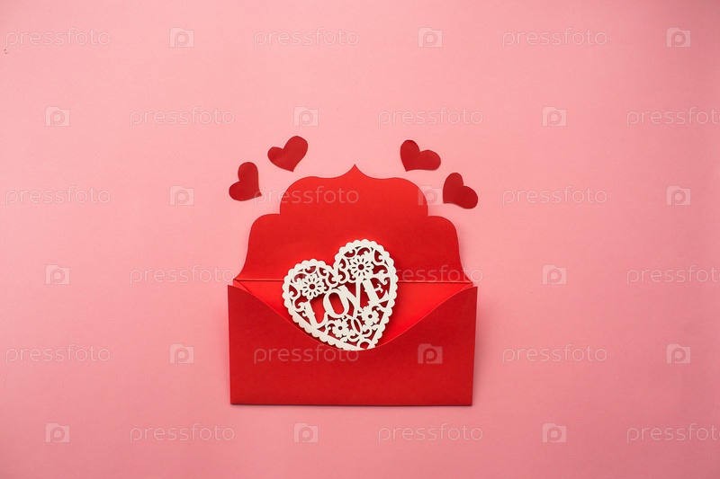 Красный конверт и белые сердца на розовом фоне. Концепция любви. Концепция Дня святого Валентина. Концепция дня матери. Плоская планировка
