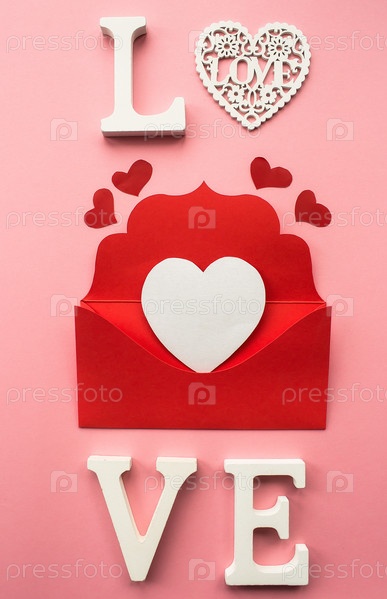 Красный конверт и белые сердца на розовом фоне. Концепция любви. Концепция Дня святого Валентина. Концепция дня матери. Плоская планировка