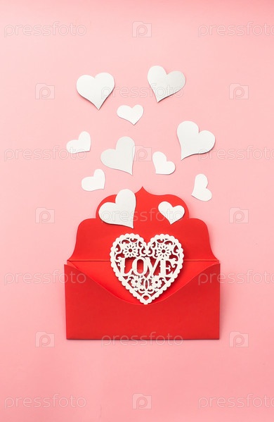 Красный конверт и белые сердца на розовом фоне. Концепция любви. Концепция Дня святого Валентина. Концепция дня матери. Плоская планировка
