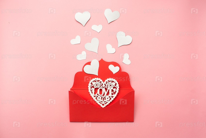 Красный конверт и белые сердца на розовом фоне. Концепция любви. Концепция Дня святого Валентина. Концепция дня матери. Плоская планировка