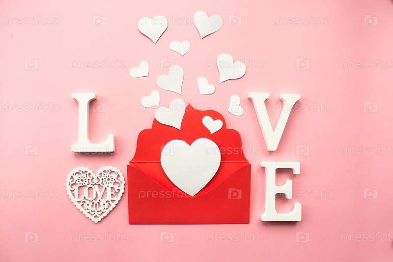 Красный конверт и белые сердца на розовом фоне. Концепция любви. Концепция Дня святого Валентина. Концепция дня матери. Плоская планировка