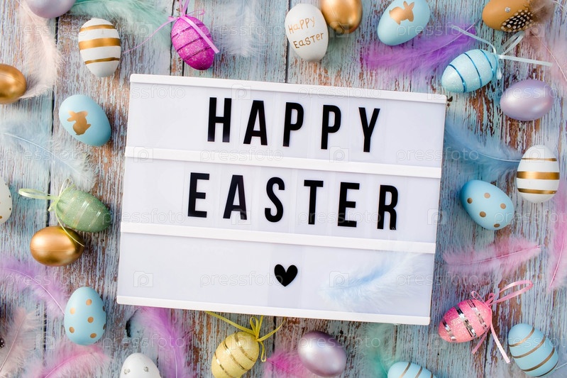 Стильная текстовая рамка лайтбокса с надписью счастливой пасхи. Розовые, голубые, белые, золотые и желтые яйца повсюду. Красочные пасхальные яйца вид сверху. Копипространство