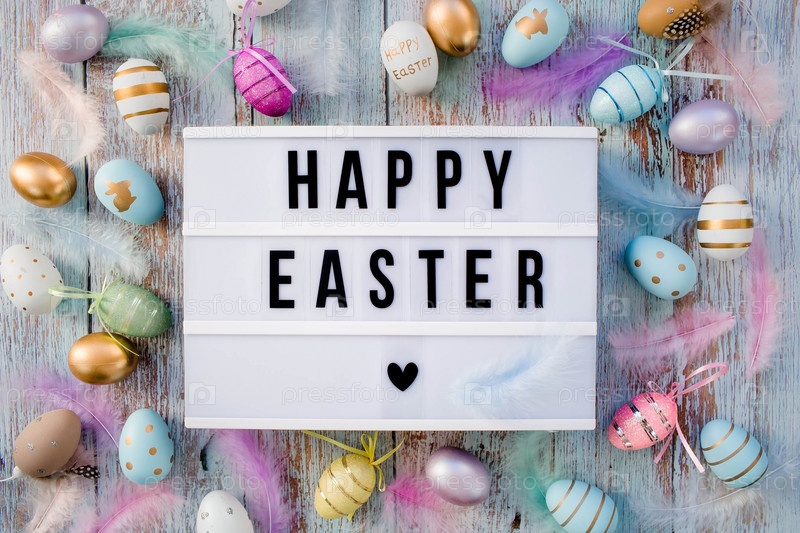 Стильная текстовая рамка лайтбокса с надписью счастливой пасхи. Розовые, голубые, белые, золотые и желтые яйца повсюду. Красочные пасхальные яйца вид сверху. Копипространство