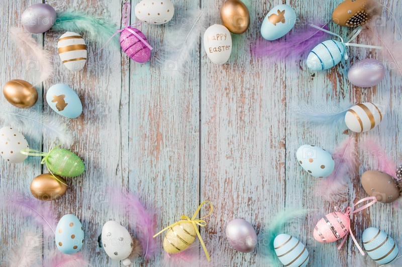 Баннер. Пасхальная рамка с яйцами и перьями на синем деревянном фоне. Минимальная концепция. Вид сверху. Карточка с копией места для текста