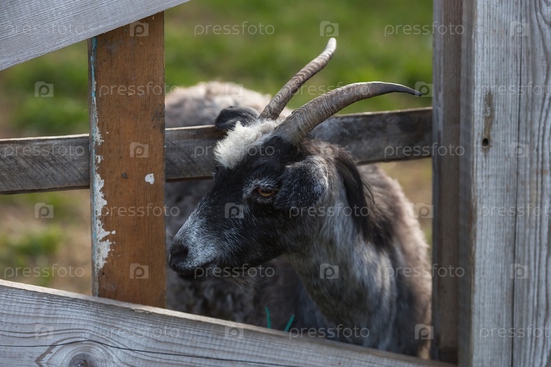 Скот. Овцы и козы в загоне. Концепция животноводства и сельской жизни. Портрет улыбающейся козы на свежем воздухе. Крупный план. Домашнее животное на частной эко ферме. Сельскохозяйственная промышленность