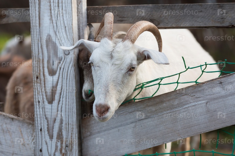 Скот. Овцы и козы в загоне. Концепция животноводства и сельской жизни. Портрет улыбающейся козы на свежем воздухе. Крупный план. Домашнее животное на частной эко ферме. Сельскохозяйственная промышленность