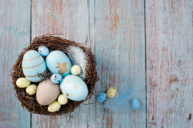 Пасхальные яйца, перья в гнезде на синем деревянном фоне. Минимальная концепция. Вид сверху. Карточка с копией места для текста