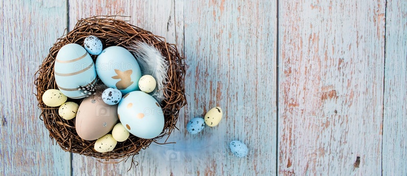 Пасхальные яйца, перья в гнезде на синем деревянном фоне. Минимальная концепция. Вид сверху. Карточка с копией места для текста