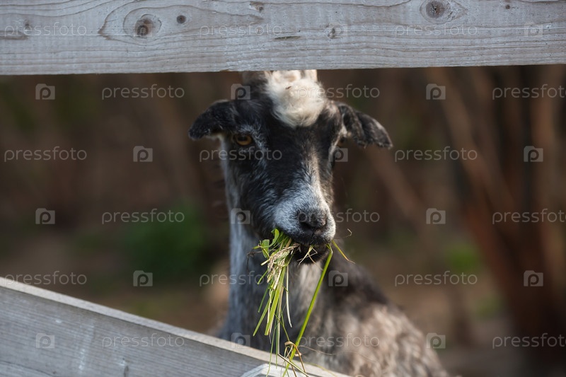 Скот. Овцы и козы в загоне. Концепция животноводства и сельской жизни. Портрет улыбающейся козы на свежем воздухе. Крупный план. Домашнее животное на частной эко ферме. Сельскохозяйственная промышленность