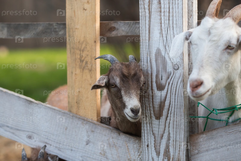 Скот. Овцы и козы в загоне. Концепция животноводства и сельской жизни. Портрет улыбающейся козы на свежем воздухе. Крупный план. Домашнее животное на частной эко ферме. Сельскохозяйственная промышленность