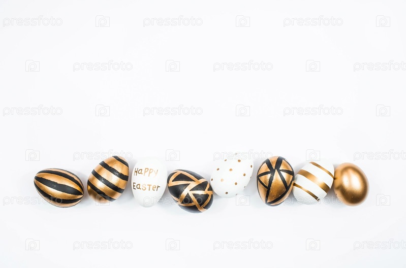 Золотые, черные, белые яйца на белом изолированном фоне. Геометрия. Минимальная концепция. Вид сверху. Пасхальная открытка с копией места для текста