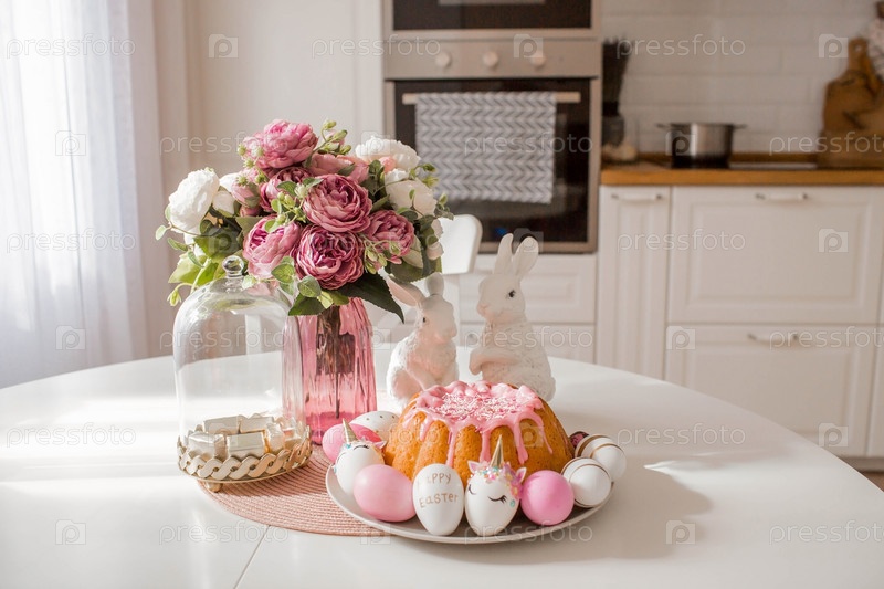 Баннер. Минимальная концепция. Кулич, кролики и яйца в виде единорога и с золотым узором на белом столе. Скопируйте место для текста