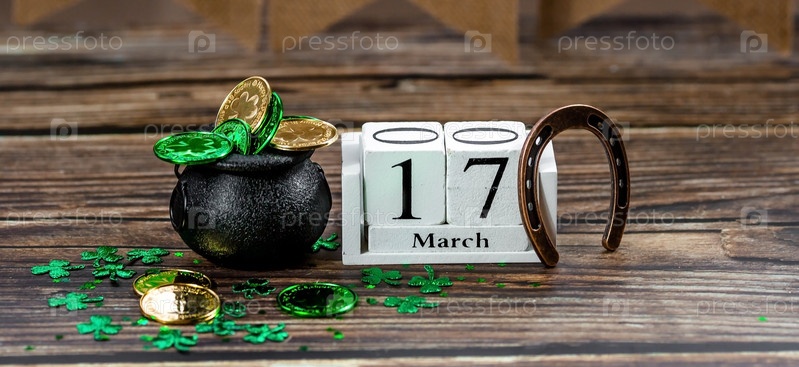 Винтажный белый календарь на День Святого Патрика, 17 марта, с счастливой подковой и горшком с золотом на деревянном фоне