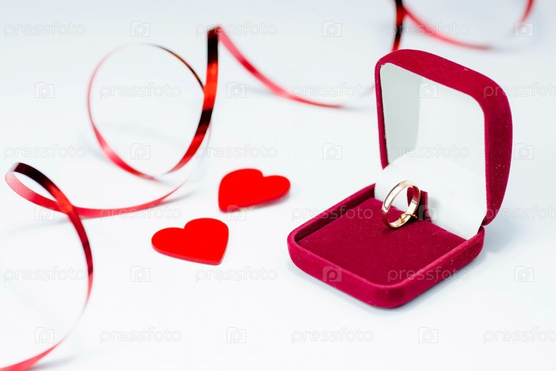 Золотое кольцо, обручальное кольцо в красной коробке и красное сердце на бело-красном фоне с красивым боке. Момент свадьбы, юбилея, помолвки или Дня святого Валентина. Счастливый день
