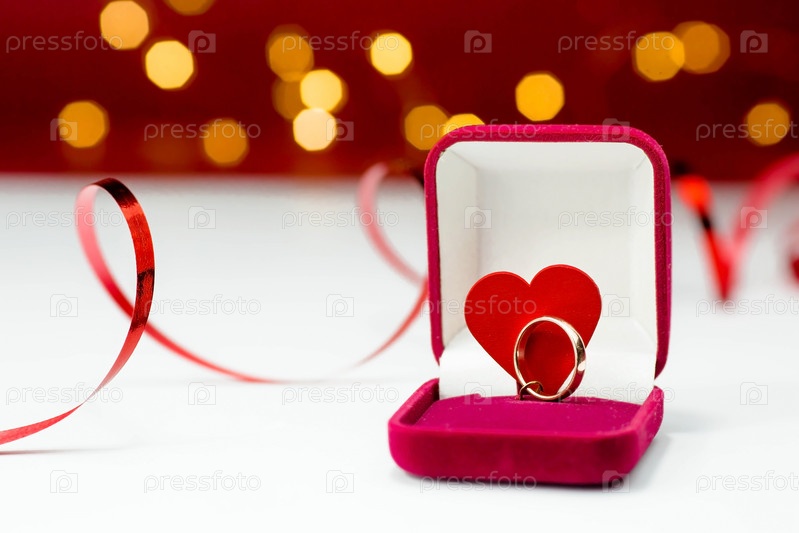 Золотое кольцо, обручальное кольцо в красной коробке и красное сердце на бело-красном фоне с красивым боке. Момент свадьбы, юбилея, помолвки или Дня святого Валентина. Счастливый день