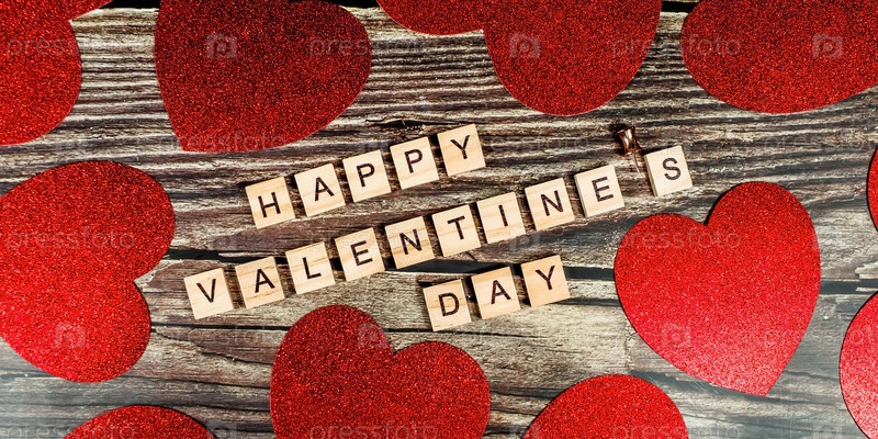 Баннер. День Святого Валентина. с днем святого валентина надпись с красными сердцами, блестками, конфетти на деревянном фоне. Концепция праздника и любви