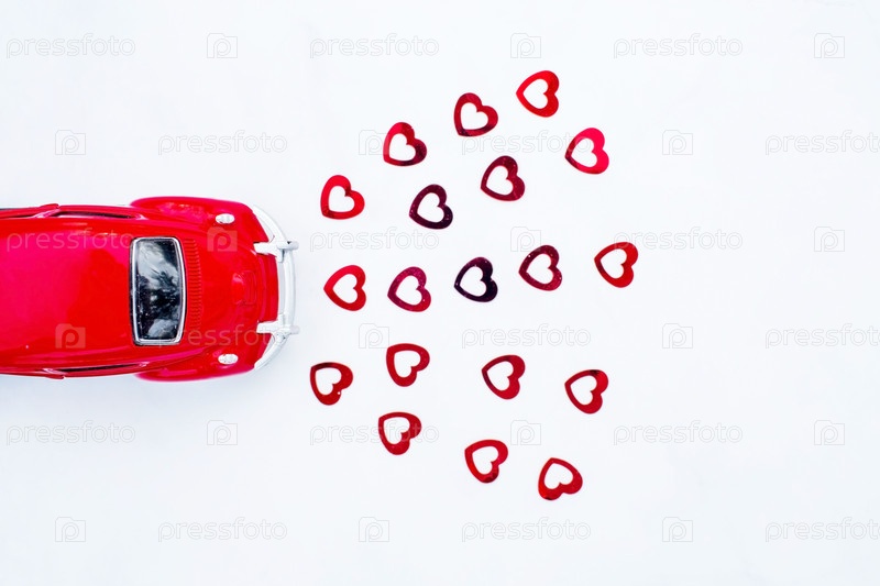 Красный ретро игрушечный автомобиль и красные сердца на белом фоне. 14 февраля открытка, День святого Валентина