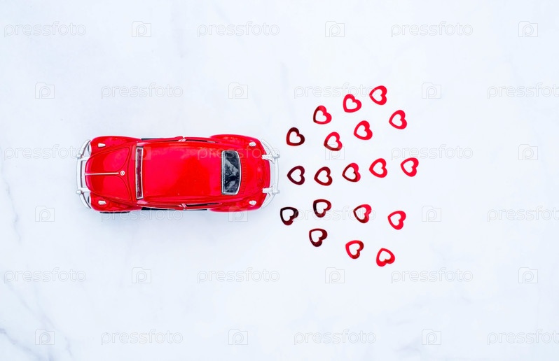 Красный ретро игрушечный автомобиль и красные сердца на белом фоне. 14 февраля открытка, День святого Валентина