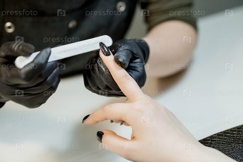 Мастер маникюра в салоне красоты выполняет процедуру окрашивания ногтей клиента. Женская мода и красота. Самообслуживание