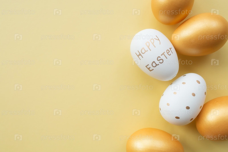 Золотые пасхальные яйца копируют пространство для текста на желтом фоне. Модная плоская планировка на пасху. Минимальная концепция