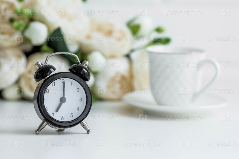 Черный ретро будильник, цветы и чашка кофе на фоне стены из белого кирпича. Концепция доброго утра