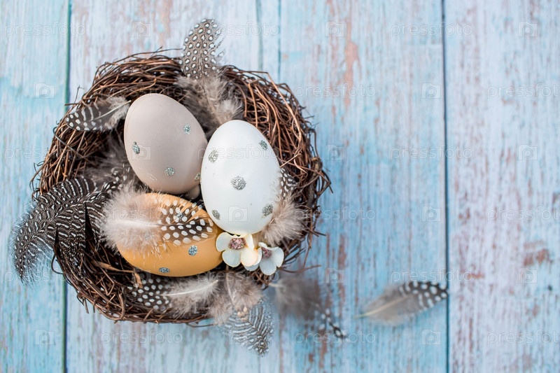 Пасхальные яйца, перья в гнезде на синем деревянном фоне. Минимальная концепция. Вид сверху. Карточка с копией места для текста