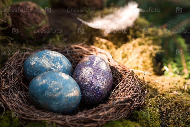С Пасхой 2023. Открытка с копией места для текста. Фиолетовые, синие и золотые яйца в гнезде на фоне естественного леса. Вид сверху