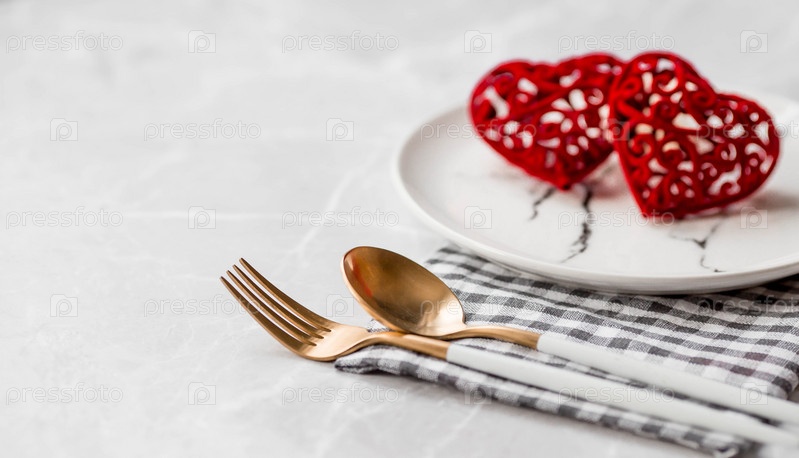 Баннер. Сервировка стола. Модная мраморная тарелка с салфеткой, вилкой и красными сердечками на сером фоне. Концепция праздника Дня святого Валентина для кафе и ресторанов. Копия места для текста