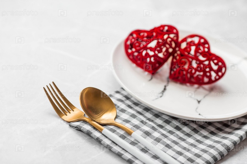 Баннер. Сервировка стола. Модная мраморная тарелка с салфеткой, вилкой и красными сердечками на сером фоне. Концепция праздника Дня святого Валентина для кафе и ресторанов. Копия места для текста