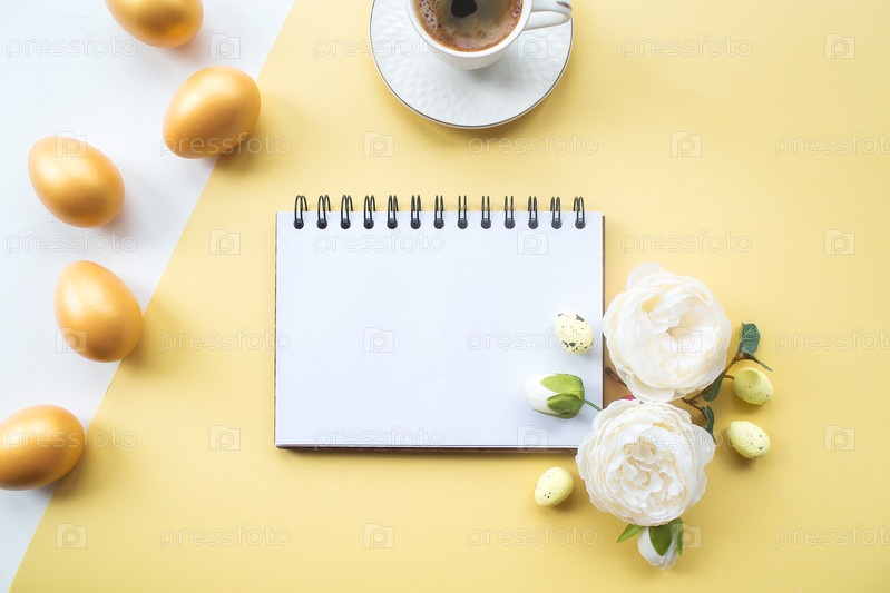Золотые пасхальные яйца, кофейная кружка, нежные цветы и блокнот