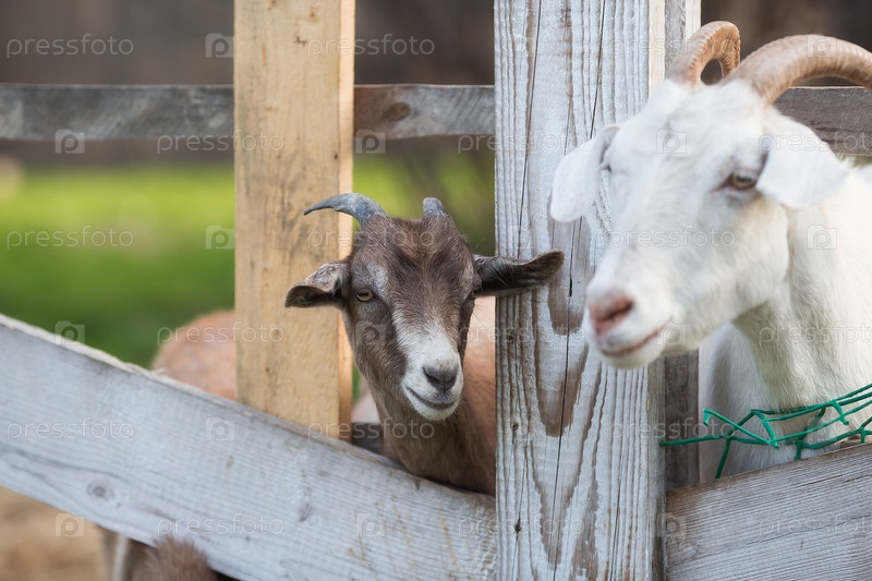 Скот. Овцы и козы в загоне. Концепция животноводства и сельской жизни. Портрет улыбающейся козы на свежем воздухе. Крупный план. Домашнее животное на частной эко ферме. Сельскохозяйственная промышленность