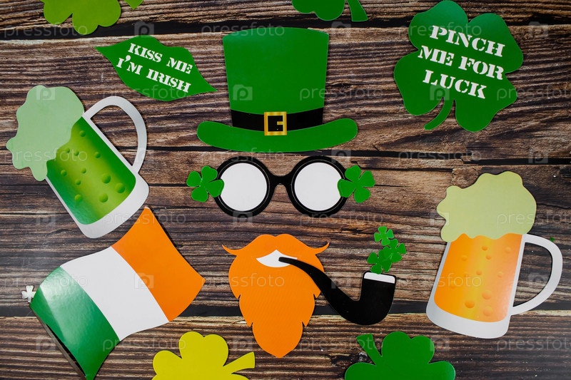 Фон ко Дню Святого Патрика, 17 марта, с праздничной гирляндой, пивом, шляпой лепрекона, клевером на деревянном фоне. Атрибуты ирландского праздника. Копия текстового пространства