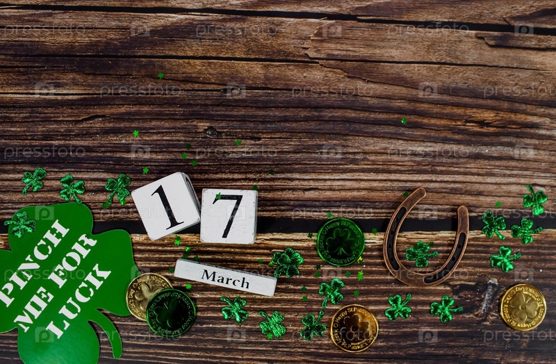 День Святого Патрика, 17 марта. Деревянный фон с листьями клевера и монетами. Копия пространства, лежащего плоско