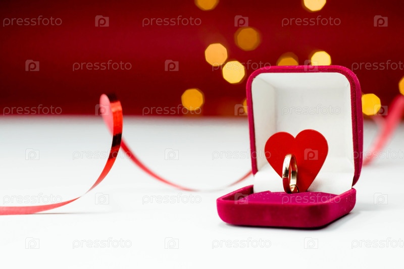 Золотое кольцо, обручальное кольцо в красной коробке и красное сердце на бело-красном фоне с красивым боке. Момент свадьбы, юбилея, помолвки или Дня святого Валентина. Счастливый день