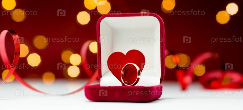 Золотое кольцо, обручальное кольцо в красной коробке и красное сердце на бело-красном фоне с красивым боке. Момент свадьбы, юбилея, помолвки или Дня святого Валентина. Счастливый день