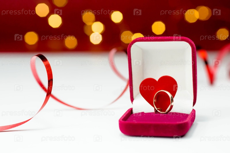 Золотое кольцо, обручальное кольцо в красной коробке и красное сердце на бело-красном фоне с красивым боке. Момент свадьбы, юбилея, помолвки или Дня святого Валентина. Счастливый день